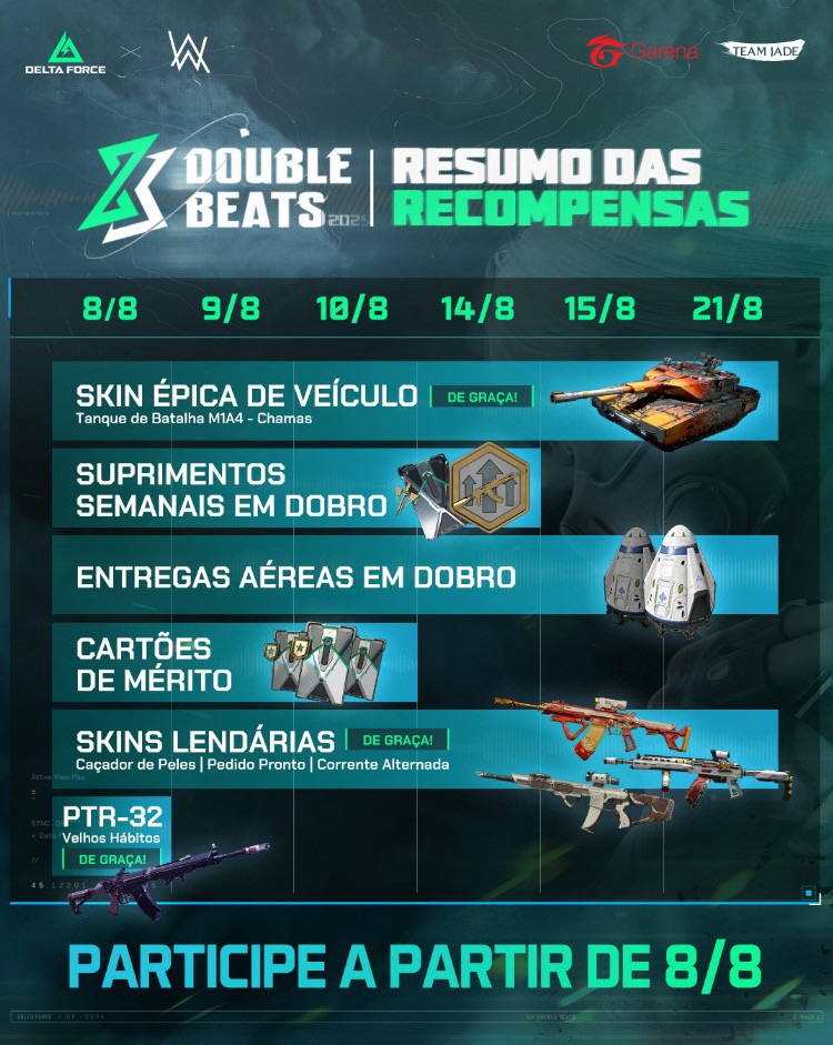 Na colaboração especial, a partir de hoje, 8 de agosto, os jogadores podem acessar o jogo e resgatar o código AW88PTRR2K para desbloquear, por tempo limitado, a skin épica da arma PTR-32 – Velhos Hábitos. Durante o evento Double Beats, também haverá missões diárias nos modos Conquista e Zona de Risco, que liberam dois conjuntos de skins lendárias à escolha dos jogadores.