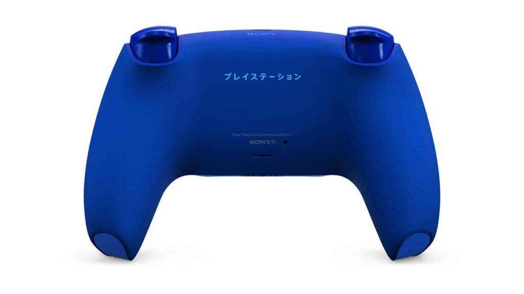 A cor e os detalhes do Icon Blue remetem aos tons de azul icônicos da história do PlayStation. Na parte traseira, o controle traz caracteres katakana formando a palavra “Pureisutēshon”, uma homenagem às origens japonesas da marca.