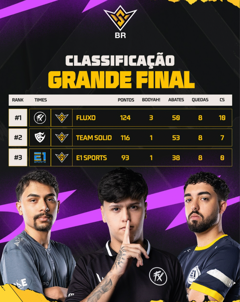 A disputa foi intensa do início ao fim. O Fluxo garantiu o título apenas na oitava queda, conquistando o Booyah decisivo que lhe deu a vantagem final de 9 pontos sobre a vice-campeã Team Solid.