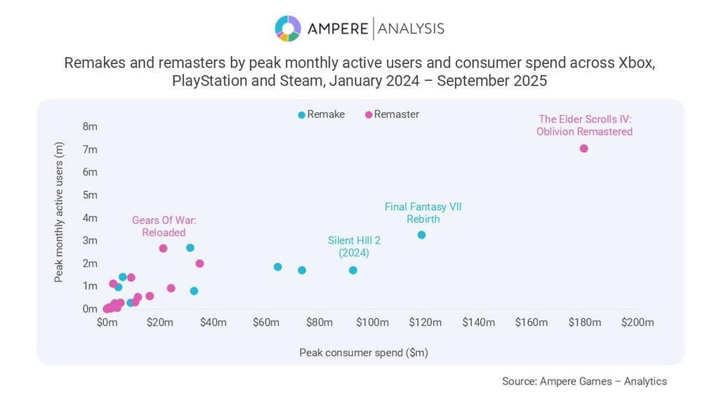 Segundo a Ampere Analysis, a principal diferença entre os dois tipos de reedições está no escopo de desenvolvimento. Remakes exigem recursos significativamente maiores, incluindo desenvolvimento gráfico, reformulação de mecânicas, atualizações de narrativa e investimento em marketing. Por outro lado, remasterizações permitem prazo de entrega mais rápido e custo reduzido, mas tendem a gerar menor engajamento e receita média mais baixa. Exceções ao padrão foram observadas em títulos como The Elder Scrolls IV: Oblivion Remastered, que alcançou picos de US$ 180 milhões em gastos dos consumidores e 7 milhões de usuários ativos mensais entre PlayStation, Xbox e Steam.