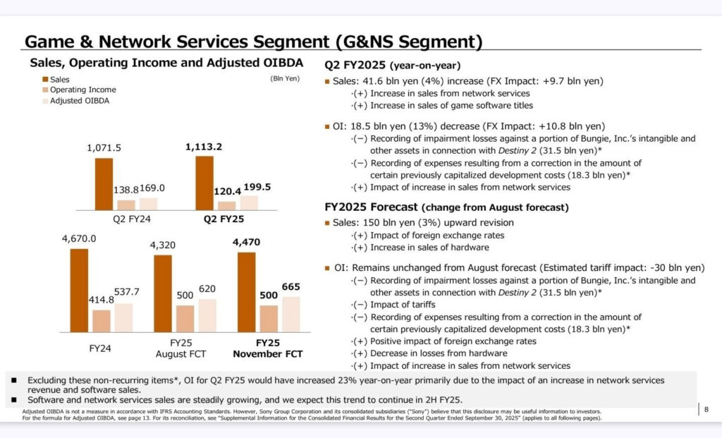 No consolidado, a divisão de jogos e serviços de rede da Sony obteve US$ 7,6 bilhões em receita, representando um aumento de 4% em relação ao mesmo período do ano anterior. O lucro operacional, contudo, foi de US$ 820 milhões, registrando uma queda de 13%. Segundo a empresa, a redução está relacionada ao aumento de custos de produção, logística e investimentos em novos estúdios e tecnologias voltadas ao futuro da plataforma. O setor de software também teve desempenho positivo, com alta de 3%, totalizando US$ 4,3 bilhões em vendas e 80,3 milhões de unidades de jogos comercializadas no trimestre.
