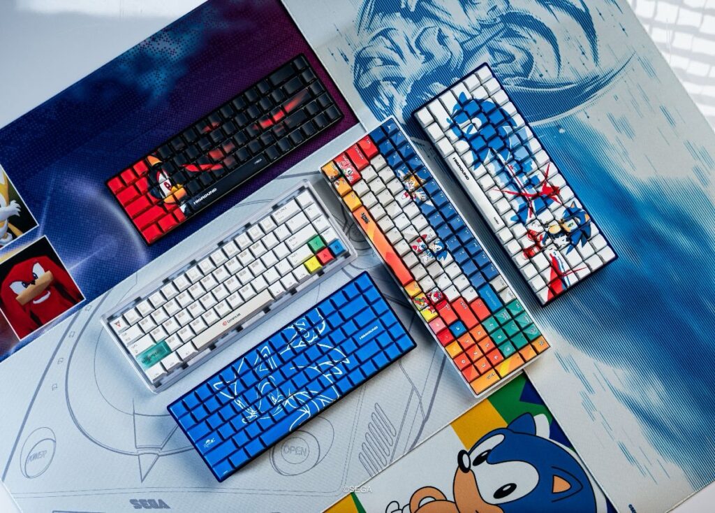 A coleção se completa com um kit de keycaps Basecamp 75+ inspirado em Sonic CD (vendido separadamente) e quatro mousepads XL Control, feitos para harmonizar com os teclados e completar o setup.