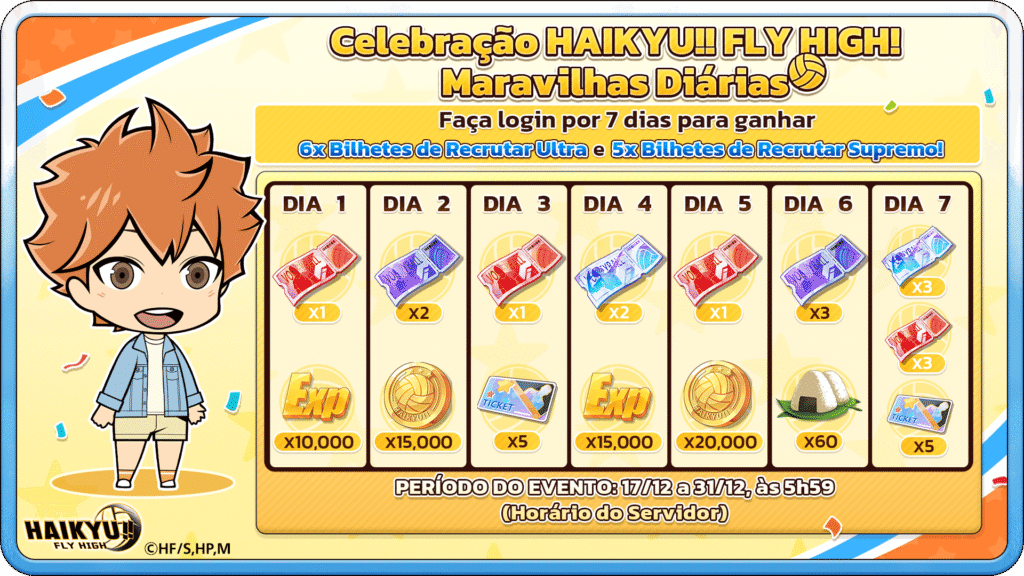 A atualização já marca a estreia do UR Tobio Kageyama, enquanto Shoyo Hinata SP será lançado em breve, completando oficialmente a dupla. Durante o período do evento, os jogadores podem participar da Celebração das Maravilhas de Inverno, que oferece recompensas valiosas, como Bilhetes de Recrutar Supremo e Ultra, além de uma Moldura para Retrato exclusiva e temporária.