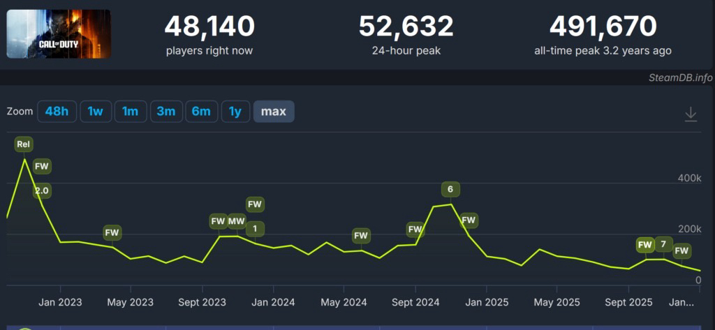 De acordo com dados do SteamDB, a base de jogadores de Black Ops 7 continuou encolhendo mesmo durante dezembro. Apenas um mês após o lançamento, o jogo registrou um pico mínimo de 43.569 jogadores simultâneos, número extremamente baixo para os padrões históricos da franquia. Embora o pico atual esteja ligeiramente acima disso, a tendência geral permanece negativa, com quedas sucessivas à medida que 2026 avança. Esse desempenho coloca Black Ops 7 como o Call of Duty com menor interesse no Steam desde 2019, reforçando a ideia de que o público de PC está cada vez mais distante da série.