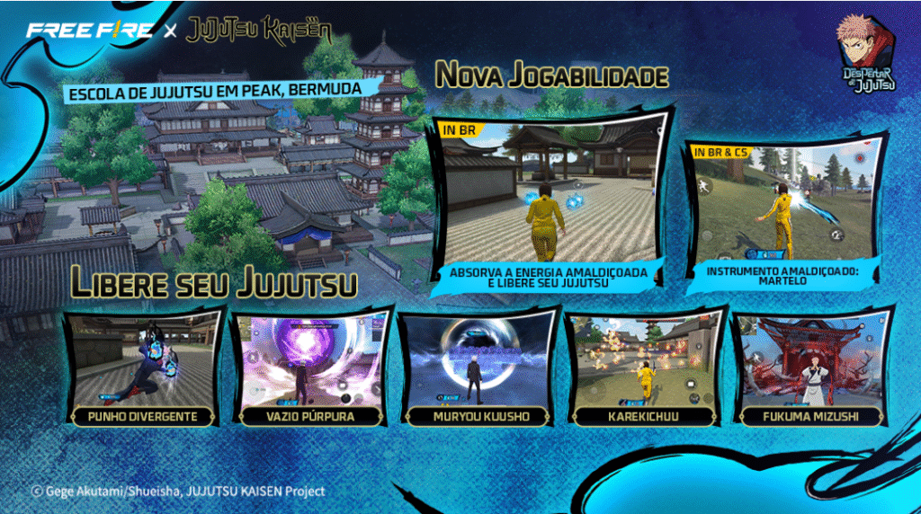 Ao longo da experiência, será possível coletar Energia Amaldiçoada para desbloquear Jujutsus poderosos, enquanto o mundo de Free Fire ganha uma releitura especial, incluindo uma versão inédita da Escola de Jujutsu. Os conjuntos de personagens contam com dublagens originais do anime, além de visuais dinâmicos e animações cinematográficas fiéis à obra.