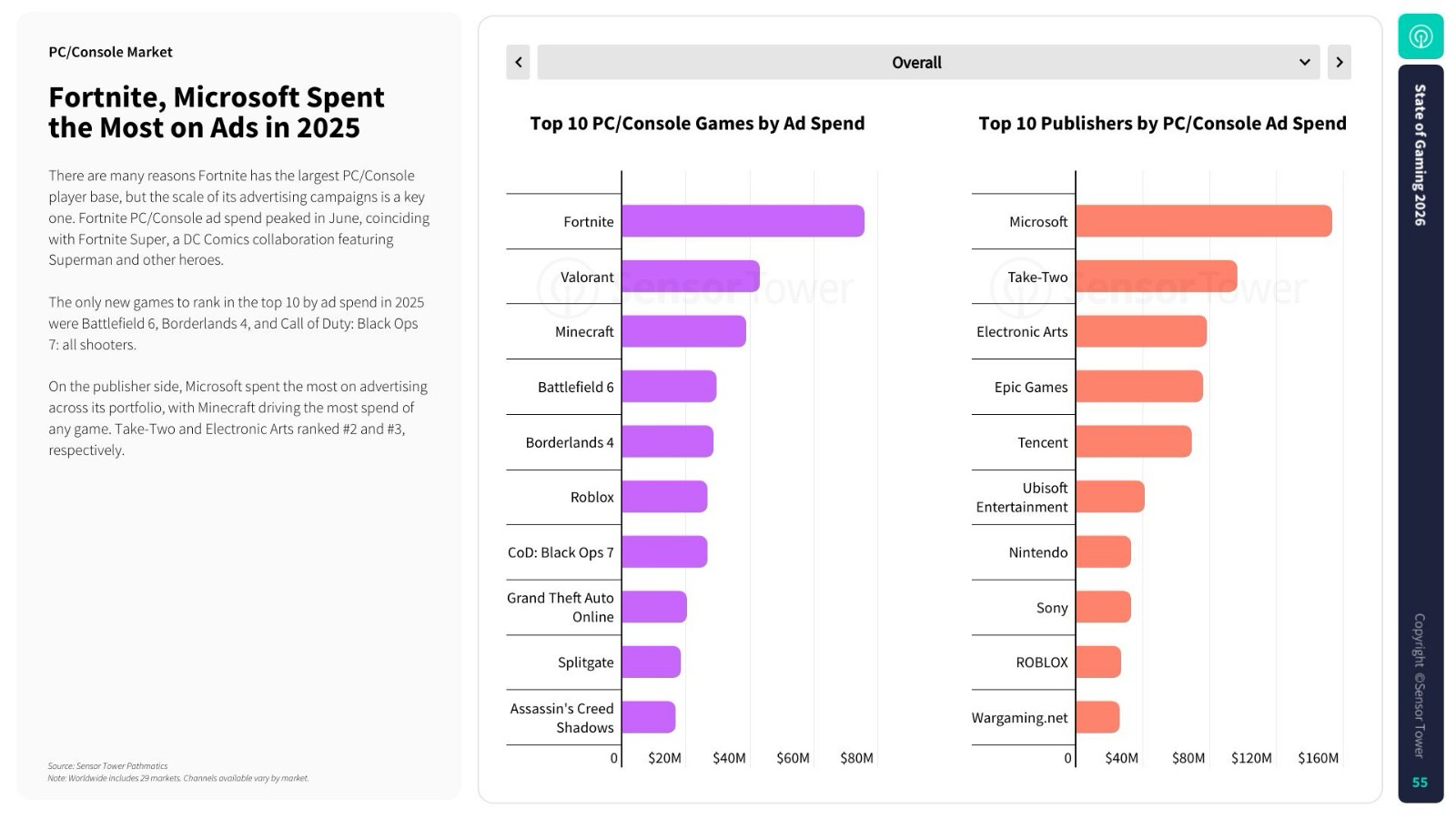 Relatório State of Gaming 2026 da Sensor Tower revela que a Electronic Arts domina o volume de downloads, enquanto a Microsoft lidera os investimentos publicitários para sustentar seu ecossistema.