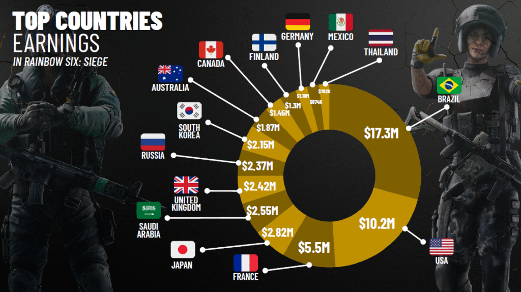 O impacto do título também aparece no desempenho das organizações brasileiras. Entre as cinco equipes nacionais com maior volume de premiações nos esports, quatro atuam em Rainbow Six Siege. A FaZe Clan lidera com US$ 4,2 milhões, seguida pela W7M Esports com US$ 3,3 milhões. A Ninjas in Pyjamas ocupa a quarta posição com US$ 2,6 milhões, enquanto a Team Liquid aparece em quinto lugar com US$ 2,3 milhões. A única exceção no top 5 é a FURIA, impulsionada principalmente por suas equipes de Counter-Strike.