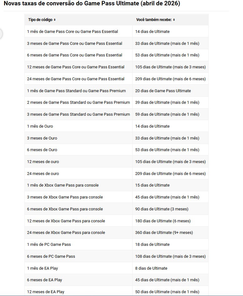 A Microsoft Gaming oficializou uma atualização abrangente nas taxas de conversão de tempo pré-pago para o Xbox Game Pass Ultimate, uma movimentação técnica que acompanha a recente redução nos preços nominais das assinaturas. O que aconteceu foi uma recalibragem dos algoritmos de migração, afetando usuários que utilizam códigos de planos como o Essential, PC Game Pass e EA Play para acumular tempo no serviço de elite da empresa. Em vigor desde abril de 2026, as novas tabelas buscam equilibrar o valor monetário de cada modalidade com o tempo de acesso concedido, aplicando percentuais que variam de 25% a 65% sobre o saldo remanescente do assinante. Para a indústria, isso importa porque altera o custo real de aquisição do serviço para os usuários mais engajados, que historicamente recorrem ao empilhamento de códigos para mitigar gastos de longo prazo.